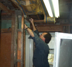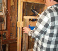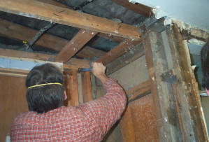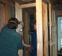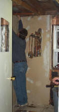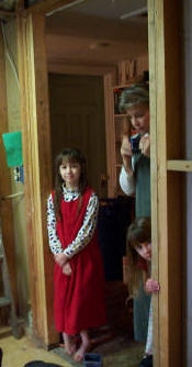 So, what reality tv or Discovery Channel shows like, While You Were Out, and Trading Spaces or Surprise by Design, etc., etc., don't show are all the errors, the real messes, little children(!), the numerous trips the hardware store, the return trips to the hardware store, the interruptions, the 586 questions and the "one more" questions, the mistakes that require much more time than one episode could accommodate, etc., etc. So... the remodel is going to hit the two week mark on Monday and will surely not be complete. However... it is moving along. All the fiberglassing stuff has been cleaned up, carried out and put away to make room for another set of messes. Another pocket door-frame has been installed and Wes is now going to work on the electrical. There are many codes to be considered---even though he continually runs into situations that are totally *not* to code. Was life sweeter/easier 100 years ago?