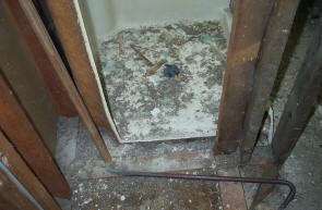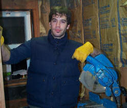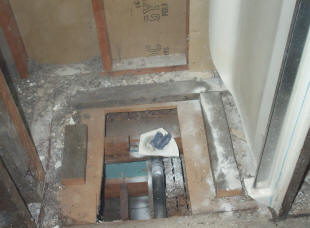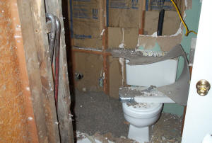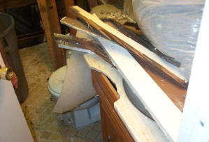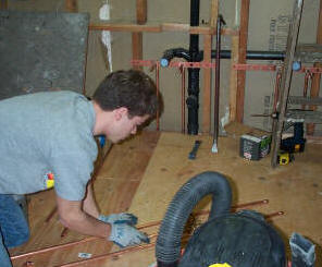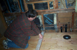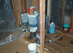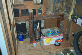 January 15, 2005 The bathroom remodel continues... As with most things, a picture is worth a thousand words. I got to thinking that what I might do is put up a page of pics and 'thumbnails' of pics for the whole project. That way, when someone asks, what does it take to refurbish a bathroom, we'll have a visual description. What does it take? Well, first, I am assuming, buckets of money. Then... patience----patience and knowledge----patience, knowledge, virtue and self-control (virtue and self-control for when things don't go as planned... and you're re-cutting a re-cut board and unscrewing well secured walls or cutting up perfect 3/4 inch plywood flooring to be sure that you've, in fact, missed the hot-water line).