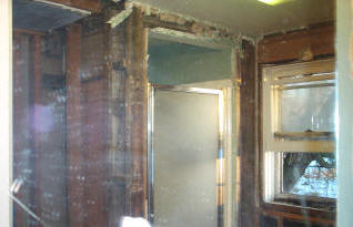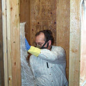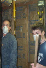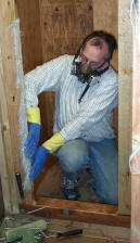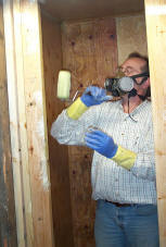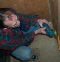 Here, Wes is applying the fiberglass mat and resin to the walls of the shower---he wears a respirator for protection of his