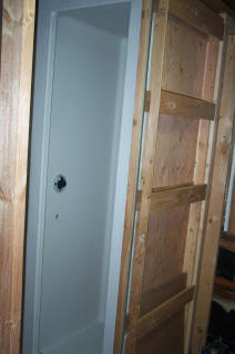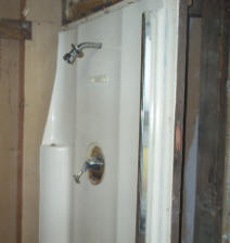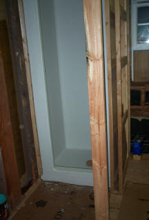 The shower is complete! Wes finished the fiberglassing at 3:30 yesterday morning and then did the final coat last night. It's very pretty. Wes will go to work on the framing, lights, fan and ductwork tomorrow. I guess I am making this remodel sound like an event at the Whitehouse. Well, I suppose work at the Whitehouse is not nearly so interesting! ;-) That room will be enclosed---you get an idea just how small it is when you think of it being twice the size of the shower with a pocket door (frame above) for privacy. The whole purpose of this remodel, besides the obvious replacement of old broken fixtures/plumbing, is to provide separate enclosed areas for nine children to use.