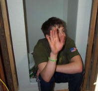 Wes taking the shower... out. I was sort of afraid he'd go through the floor... or the ceiling, rather, in the bathroom below.