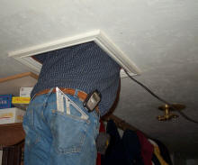 January 22, 2005 The only thing that "Reality TV" prepares one for is... some of what to expect in another episode of Reality TV. And another thing... Reality TV is anything but: reality---well, at least not my personal reality. For example, the show, While You Were Out, gives the impression that *all* remodels (single room remodels, that is) can be done in one episode---yes, two or three days are covered in an episode which lasts less than an hour, but what you don't have in "reality living" are the few dozen workers, endless energy and enthusiasm, and so many other things that don't happen living in reality. And so it goes... and goes. So, Wes is in the middle of the three day week bathroom remodel. So there was the nasty blown insulation and little gifts interspersed among the insulation and between the floors, then the old knob and tube wiring and new (a relative term) wiring, and walls that aren't plumb (some due to slight settling of the house and some... who knows?), and then there's the occasional redrawing of plans bcz the original thoughts needed to change with additional information (what was discovered *after* the project was begun. Now, mind you all this "remodeling" is taking place in a 7.4 x 8.2 room. I know, I know... you're probably doing the math... how in the world does a 5' double sink vanity and an enclosed toilet *and* an enclosed shower "room" fit in that space. As with many things in our home... it's the life of the hard to believe. Well, so... yes------there's not going to be enough room in there to change one's mind!