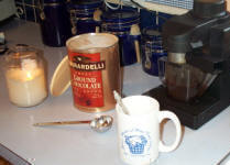 I was making my coffee and thought maybe I ought to tell about another part of the dailies... you see what's going on in the bathroom... so here's what's going on in the kitchen. I make mocha's in my MOMYS coffee mug filled with 1/2 cup of hot milk, espresso coffee made in the Melitta espresso maker; then I add a spoonful of Ghirardelli's ground chocolate/cocoa. I'd love a "barista" sort that does all the foam and all that, but this one works just fine. Yesterday I made a couple of cups---one for me and one for Samuel. He was doing a job for me that I couldn't do. He donned a mask and sprayed some of the attic with bleach water to kill any mold that was up there. With that industrial fan going, he sprayed those surfaces so that everything could dry before Wes did the electrical work---which became more fun for him as the afternoon went by. He didn't mind---and surely didn't mind the mocha, either.  |