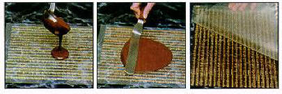 You can see the chocolate being poured onto the sheet and the *offset* spatula used to smooth the chocolate evenly
